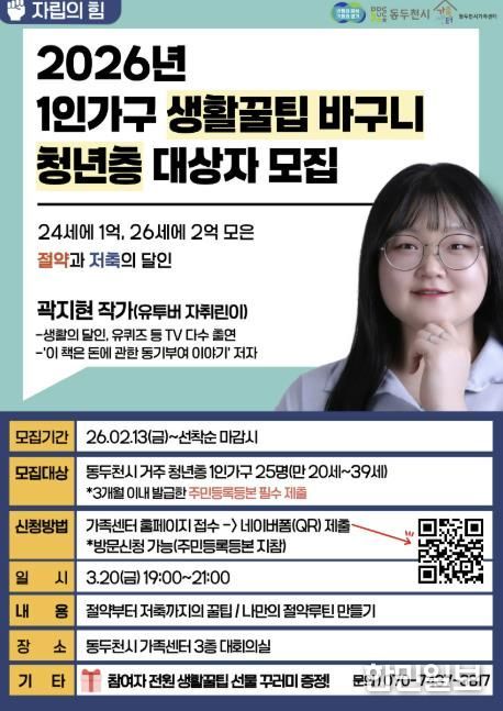 이번 프로그램은 연령별 맞춤 생활꿀팁 강의와 생활꿀팁 꾸러미를 제공하고, 2026년 동두천시 1인 가구 지원사업을 소개하는 시간도 함께 마련해 다양한 맞춤형 프로그램 연계를 지원할 예정이다.
