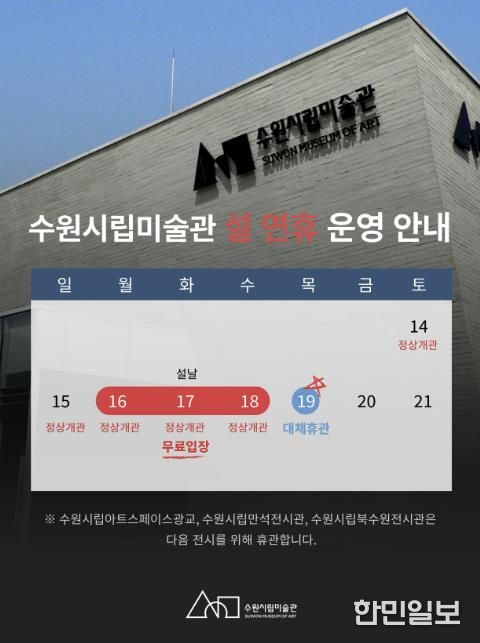 수원시립미술관 행궁 본관은 설 연휴 기간인 2월 15일부터 18일까지 정상 개방하며 설 당일인 2월 17일에는 무료 관람을 실시하며, 2월 19일에 대체 휴관한다.