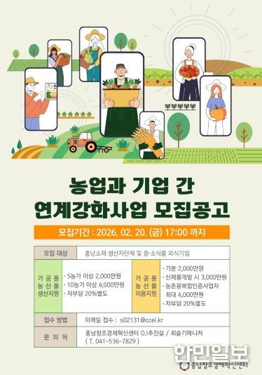 한민일보 서울포커스 박덕환 기자 | (재)충남창조경제혁신센터는 ‘2026년 농업과 기업 간 연계강화 지원사업’ 참여 대상을 모집한다고 밝혔다.