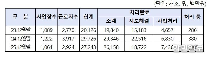 광주지방고용노동청에 따르면 지난해 12월 말 기준 도내 체불임금은 누계 272억원으로 2024년도 297억원 대비 8.4% 감소했다.