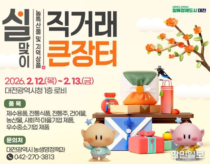 한민일보 서울포커스 유한희 기자 | 대전광역시는 다가오는 설 명절을 맞아 시민들의 장바구니 부담을 덜고 지역 농가의 판로를 지원하기 위해 오는 2월 12일부터 13일까지 이틀간 시청 1층 로비에서‘설맞이 우수 농·특산물 및 지역상품 직거래 장터’를 개최한다.