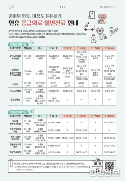 한민일보 서울포커스 심기옥 기자 | 포천시는 오는 14일부터 18일까지 설 연휴 기간 동안 시민들이 안정적으로 의료서비스를 이용할 수 있도록 응급대응체계를 강화한다.