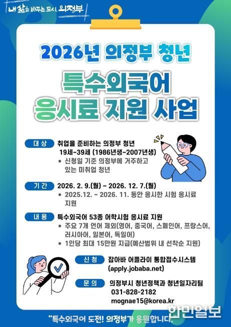 한민일보 서울포커스 심기옥 기자 | 의정부시는 청년 1인에게 최대 15만 원까지 특수외국어 어학시험 응시료를 지원하는 ‘2026년 의정부 청년 특수외국어 응시료 지원사업’을 시작했다.