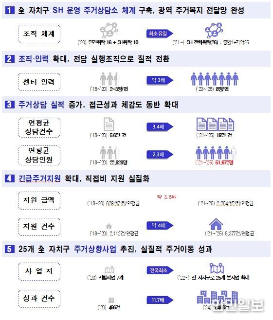 비닐하우스를 비롯한 쪽방·고시원 등 취약한 환경에서 거주 중인 시민에게 임대주택을 제공하는 ‘주거상향사업’은 2020년 7개 자치구 시범사업을 시작으로 2022년부터 전체 자치구에서 확대 운영 중이다. 지원 규모는 2020년 466건에서 2025년 5,418건으로 11배가량 늘어 시민들의 주거안전과 주거 질 개선에 기여했다는 평가다.