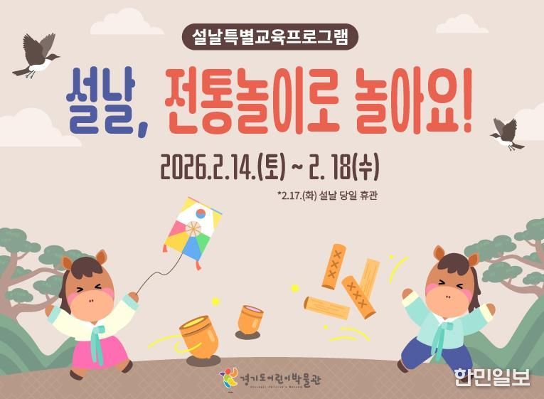 한민일보 서울포커스 김윤이 기자 | 경기문화재단 경기도어린이박물관은 설날을 맞이하여 2026년 2월 14일부터 2월 18일까지 설날 특별프로그램 '설날, 전통놀이로 놀아요!'를 운영한다. 설 연휴 동안 박물관을 방문하는 어린이와 동반 가족을 위해 가족 간의 유대감을 높일 수 있는 전통문화 체험프로그램 3종을 준비했다.
