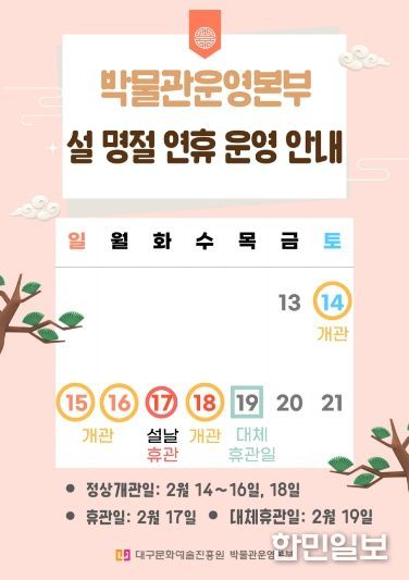 한편, 대구시립 3개 박물관은 설 연휴 다음날인 2월 19일(대체휴관일)에는 하루 쉰다.