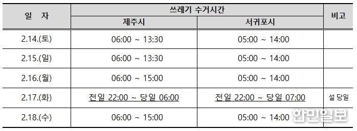 이와 함께 제주도는 연휴 기간 중 발생하는 쓰레기 관련 생활 민원에 신속히 대처하기 위해 ‘생활쓰레기 처리 종합상황실’도 운영한다.
