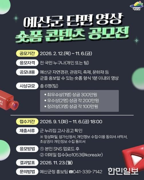 한민일보 서울포커스 임경복 기자 | 예산군은 지역의 숨은 매력을 담은 단편 영상(숏폼) 콘텐츠 발굴을 위해 ‘예산군 숏폼 콘텐츠 공모전’을 개최한다고 12일 밝혔다.