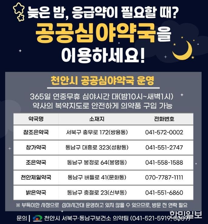 공공심야약국은 △참조은약국(쌍용동) △창가약국(성황동) △조은약국(봉명동) △천안제일약국(문화동) △밝은약국(신부동)이다.