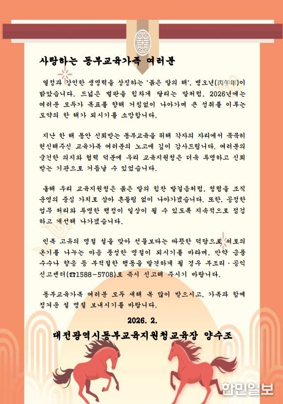한민일보 서울포커스 유한희 기자 | 대전동·서부교육지원청은 설 명절을 맞이하여 청렴 실천의지를 담은 교육장 서한문을 관내 유·초·중학교 및 교육지원청 교직원들에게 발송했다고 밝혔다.