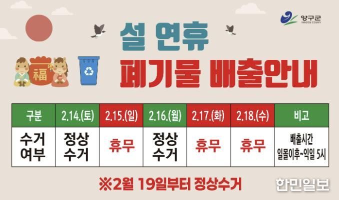 또한 쾌적하고 편안한 연휴를 위해 양구군은 쓰레기 처리 상황반과 읍면별 기동 청소반을 운영하여 쓰레기 다량 배출 및 투기가 예상되는 지역을 수시로 점검·관리할 계획이다. 연휴 기간 중 15일과 17일~18일을 쓰레기 배출하지 않는 날로 지정·운영한다. 연휴 시작 전 쓰레기 수거일 조정에 대한 충분한 홍보와 14일과 16일에 집중 수거해 주민 불편을 최소화할 계획이다. 연휴가 끝난 후에는 다중 이용 장소와 청소 취약지역에 대한 마무리 환경 정비를 실시할 예정이다.
