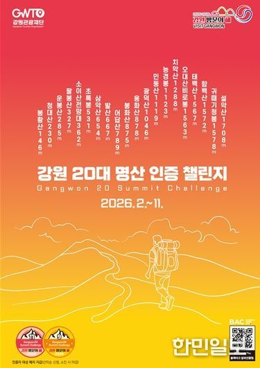 한민일보 서울포커스 곽중희 기자 | 강원특별자치도와 강원관광재단은 오는 2월 23일부터 11월까지 ‘강원 20대 명산 인증챌린지’를 운영한다.