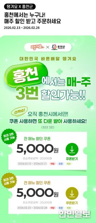 이번 이벤트는 신한은행 ‘땡겨요’ 사업단과의 공동 마케팅 협약을 바탕으로 추진됐으며, 공공배달앱 활성화를 통해 소상공인의 경영 부담을 완화하고 지역 경제의 활력을 회복하고자 마련된 홍천군 차원의 정책적 대응이다.