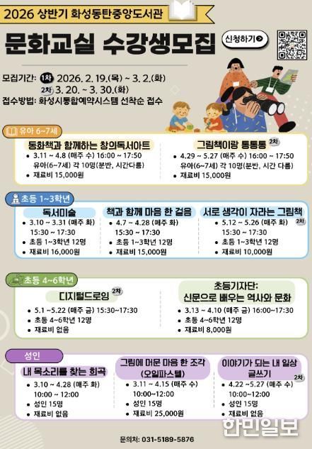 한민일보 서울포커스 진광성 기자 | 화성특례시는 지난해 11월 3일 개관한 화성동탄중앙도서관에서 시민들이 다양한 독서·문화 활동을 즐길 수 있도록 2026년 상반기 문화교실 프로그램을 운영한다고 밝혔다.
