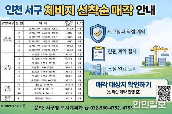 한민일보 서울포커스 김용택 기자 | 인천 서구는 도시개발구역·구획정리사업지구 내 체비지 잔여 물량 17필지를 선착순 수의계약 방식으로 매각한다고 밝혔다.