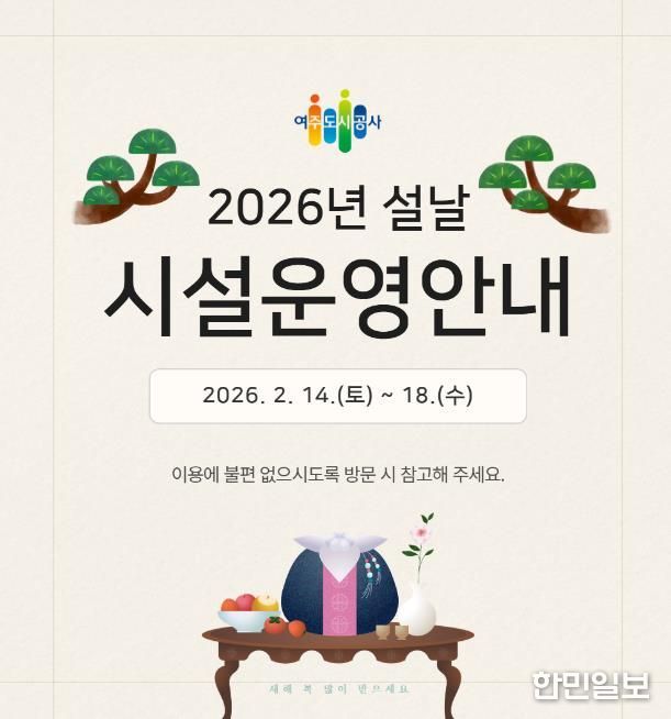 한민일보 서울포커스 전희주 기자 | 여주도시공사가 다가오는 2026년 설 연휴를 맞아 시민과 귀성객들이 안전하고 편안한 명절을 보낼 수 있도록 주요 시설 운영시간 조정 및 특별 서비스를 시행한다고 밝혔다.