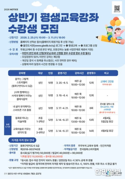 한민일보 서울포커스 김서윤 기자 | 경상북도교육청 울진도서관은 오는 3월부터 6월까지 ‘상반기 평생교육강좌 및 늘봄도서관’을 운영한다.