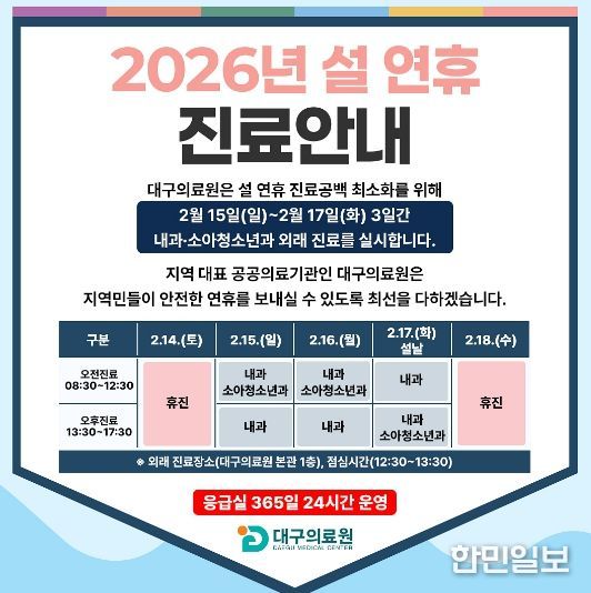 대구의료원은 설 연휴를 대비해 2월 15일부터 17일까지 3일간 지역의 진료 공백 해소를 위해 내과·소아청소년과 전문의 외래 진료를 시행한다.