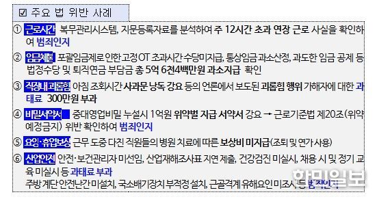 이와 함께 연장·야간·휴일근로 수당 등 임금 미지급 5억 6천4백만원에 대해서도 시정지시했다.