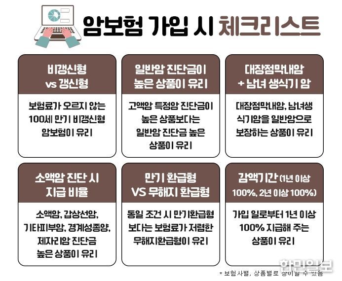 우선, 암보험을 가입하기 위해서는 갱신형 상품과 비갱신형 상품중에서 선택을 해야 한다. 갱신형은 처음 가입 시에는 보험료가 상대적으로 저렴하지만 갱신을 이어가면서 보험료가 계속 인상될 수 있고, 비갱신형은 초기 보험료는 갱신형보다 높을 수 있지만, 가입 후에 보험료인상이 없어 안정적으로 유지관리가 가능한 장점이 있다. 따라서 이러한 장단점을 고려하여 본인의 상황에 맞게 선택하는 것이 좋다.
