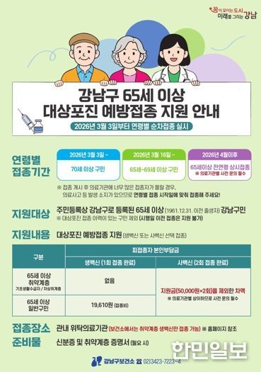 한민일보 서울포커스 박정민 기자 | 꿈이 모이는 도시, 미래를 그리는 강남구가 65세 이상 강남구민을 대상으로 대상포진 예방접종 지원을 확대한다. 기존 기초생활수급자 중심의 지원을 65세 이상 전체 구민으로 넓히고, 3월 3일부터 연령별 순차 접종을 시행한다.