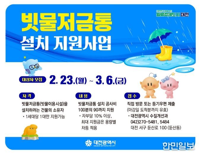 한민일보 서울포커스 유한희 기자 | 대전시는 기후변화로 인한 가뭄과 물 부족 문제에 선제적으로 대응하고 물 재이용 문화 확산을 위한‘2026년 빗물저금통 설치 지원사업’을 추진한다고 밝혔다.