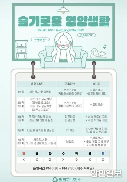 팔달구보건소 관계자는 “다 회차 프로그램으로 참여자들의 자기 주도적 건강 식생활 실천 능력을 높이고, 올바른 식생활 인식을 확산하겠다”며 “1인 가구의 영양 불균형 완화에 도움이 되길 바란다”고 말했다.