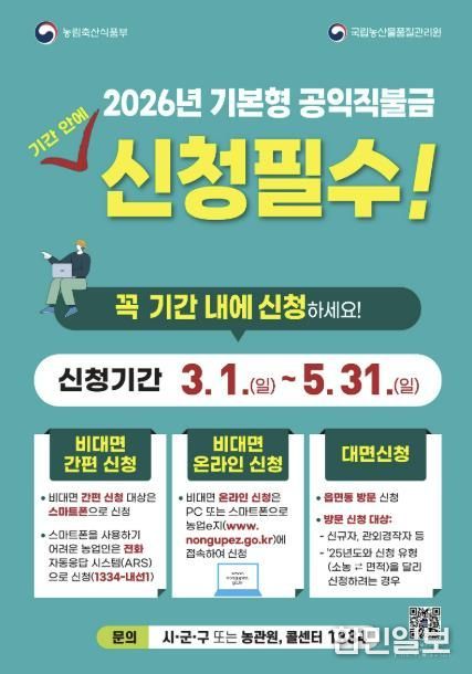 한민일보 서울포커스 심기옥 기자 | 포천시는 오는 3월 1일부터 농업의 공익적 기능을 강화하고 농업인의 소득 안정을 지원하기 위한 ‘2026년 기본형 공익직접지불금’ 신청을 받는다.