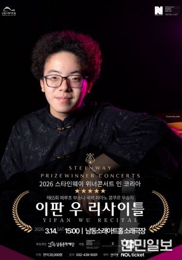 한민일보 서울포커스 김성혜 기자 | 인천시 남동구 남동문화재단은 제65회 페루초 부소니 국제 피아노 콩쿠르 우승자인 이판 우(YIFAN WU)의 피아노 리사이틀 공연을 남동소래아트홀에서 3월 14일 15시에 개최한다고 19일 전했다.