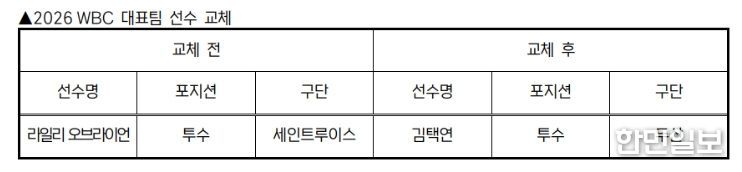 한민일보 서울포커스 최성훈 기자 | KBO 전력강화위원회는 부상으로 인해 WBC 참가가 어려워진 세인트루이스 라일리 오브라이언을 대체할 선수로 두산 김택연을 확정하고 WBC 조직위에 선수 교체 승인을 요청했다.