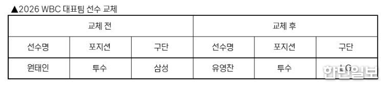 한민일보 서울포커스 최성훈 기자 | KBO 전력강화위원회는 부상으로 인해 WBC 참가가 어려워진 삼성 원태인을 대체할 선수로 LG 유영찬을 확정하고 WBC 조직위에 선수 교체 승인을 요청했다.