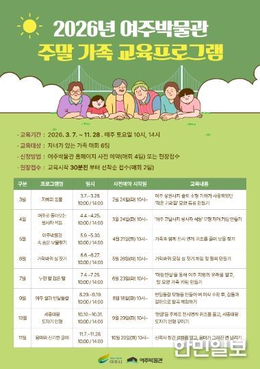 한민일보 서울포커스 전희주 기자 | 여주시 여주박물관은 오는 3월 7일부터 11월 28일까지 매주 토요일, 가족 단위 관람객을 대상으로 한 ‘2026년 주말 가족 대상 교육프로그램’을 운영한다.