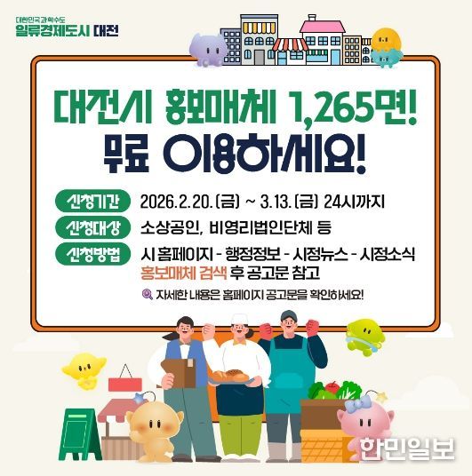 이호영 대전시 홍보담당관은 “홍보매체 이용사업은 광고기획 및 디자인 제작, 게시까지 전 과정을 지원함으로써 관내 소상공인과 단체의 부담을 덜고 홍보의 공익적 기능을 실현하기 위한 사업이다”라며 “관심 있는 업체의 적극적인 참여를 바란다”라고 말했다.