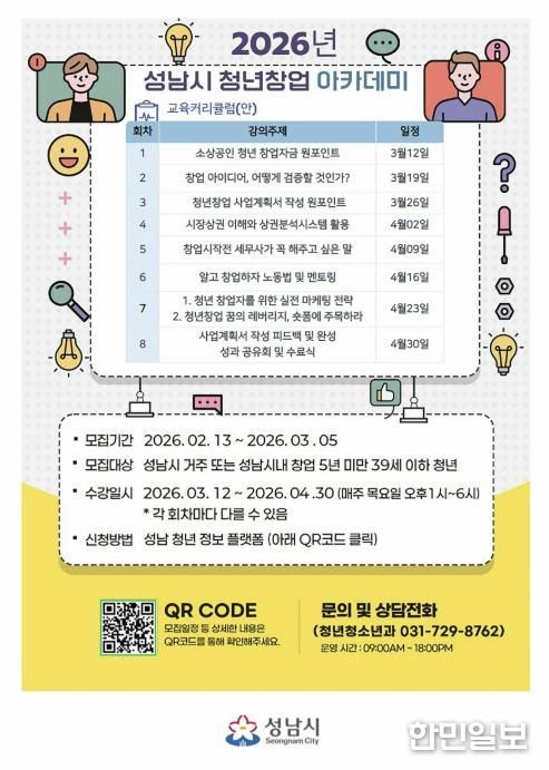 한민일보 서울포커스 김성혜 기자 | 성남시는 오는 3월 5일까지 ‘청년창업 아카데미’ 무료 교육생 30명을 모집한다.