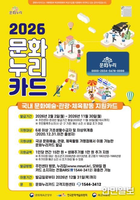 문화누리카드는 복권기금으로 운영되는 공익사업으로, 6세 이상(2020년 12월 31일 이전 출생) 기초생활수급자 및 차상위계층에게 문화예술·국내관광·체육활동에 사용할 수 있는 이용권을 지원하는 제도다. 올해 지원금은 1인당 연간 15만 원으로, 지난해보다 1만 원 인상됐다.
