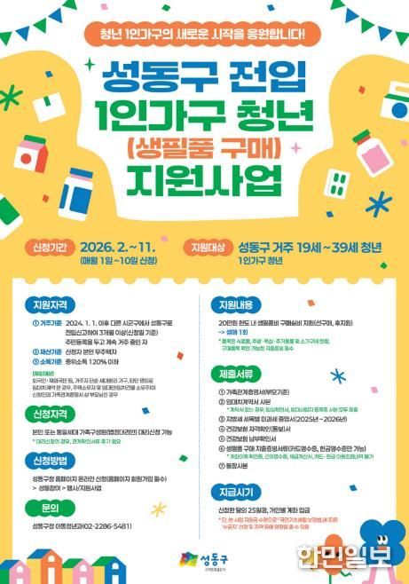 성동구는 지난 2024년 3월부터 시행해 온 ‘전입 1인가구 청년 생필품 구매지원사업’을 확대 추진함으로써 자립 초기 청년들의 경제적 불안감을 줄이고 실질적인 생활 기반 마련을 도와 독립생활을 안정적으로 시작할 수 있게 응원하고자 한다.