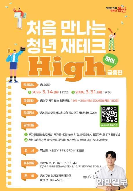한민일보 서울포커스 김서윤 기자 | 서울 용산구가 19일부터 내달 11일까지 ‘처음 만나는 청년 재테크 하이(High) 금융편’ 교육 프로그램에 참여할 청년 총 300명을 모집한다. 경제 교육 수요를 반영해, 지역 내 청년들의 합리적인 금융 의사결정과 기초 재테크 역량 강화를 위해 마련한 자리다.