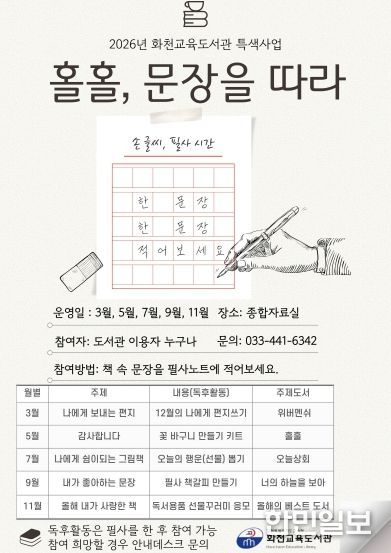 한민일보 서울포커스 곽중희 기자 | 화천교육도서관은 오는 3월부터 11월까지 깊이 있는 독서문화의 확산을 위해 2026년 특색사업 ‘홀홀, 문장을 따라’를 운영한다.