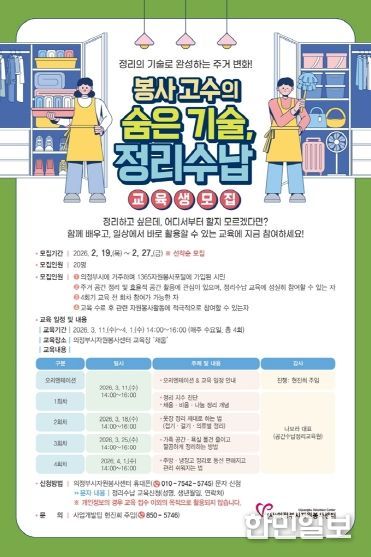 한민일보 서울포커스 심기옥 기자 | 의정부시자원봉사센터는 시민들의 주거환경 개선 역량 강화를 위해'봉사고수의 숨은 기술, 정리수납 교육'을 오는 3월 11일부터 4월 1일까지 매주 수요일 오후 2시부터 4시까지 총 4회에 걸쳐 진행하며, 이에 따른 참여자를 오는 2월 27일까지 모집한다.