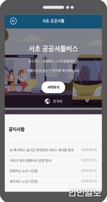한민일보 서울포커스 곽중희 기자 | 서울 서초구는 23일부터 서초종합체육관 공공 셔틀버스에도 실시간 위치안내 서비스를 도입해 주민의 이동 편의를 한층 더 높인다.
