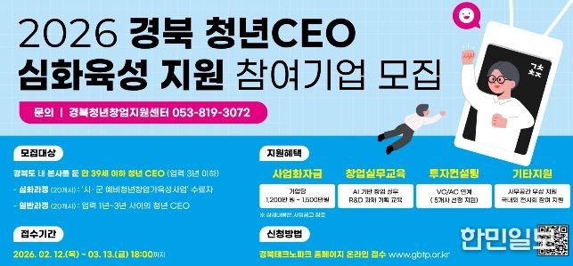 한민일보 서울포커스 임철현 기자 | 경상북도는 창업 초기 청년기업의 안정적인 정착과 성장을 지원하기 위해 오는 3월 13일까지 ‘2026 경북 청년CEO 심화육성 지원사업’참여 기업 40개사를 모집한다.