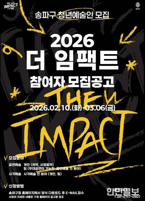 한민일보 서울포커스 박정민 기자 | 서울 송파구는 재능 있는 청년예술인을 발굴·지원하는 ‘2026 더 임팩트’ 참가자를 오는 3월 6일 오후 5시까지 모집 중이라고 23일 밝혔다. 이번 공모는 지난 2월 10일부터 접수가 진행되고 있다.