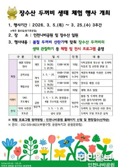 한민일보 서울포커스 김성혜 기자 | 부평구는 오는 3월 5일부터 25일까지 인천나비공원과 장수산 일대에서 ‘장수산 두꺼비 생태 체험 행사’를 개최한다.