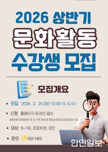 한민일보 서울포커스 곽중희 기자 | 태백교육도서관은 3월 18일부터 7월 8일까지 지역 내 유아·초등학생·성인을 대상으로 ‘2026년 상반기 문화활동강좌’를 운영한다.