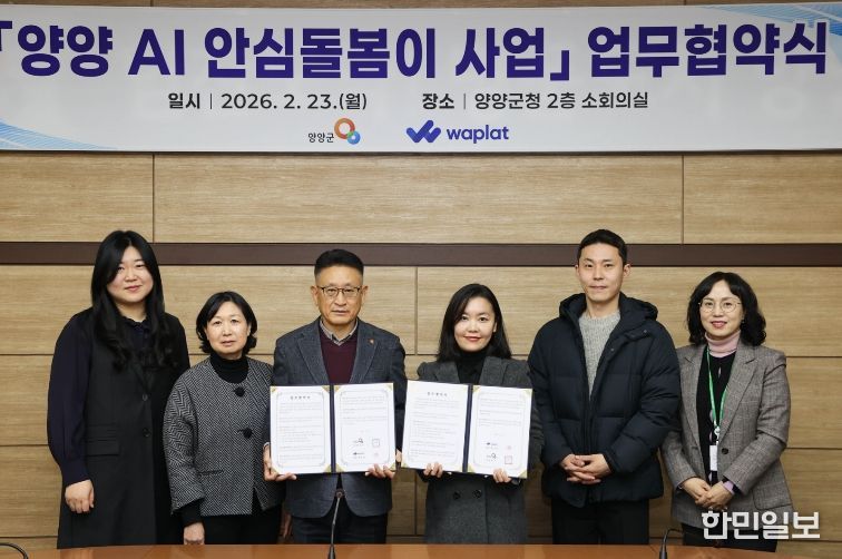 한민일보 서울포커스 진광성 기자 | 양양군은 23일 오전 군청 소회의실에서 와플랫 주식회사(대표 황선영)와 ‘양양 AI 안심 돌봄이 사업’ 추진을 위한 업무협약(MOU)을 체결했다고 밝혔다.