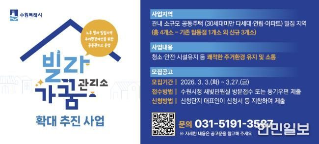 한민일보 서울포커스 진광성 기자 | 수원특례시는 노후 빌라 밀집지역을 체계적으로 관리하고, 주거환경을 개선하는 ‘2026년 빌라가꿈관리소 확대 추진사업’의 대상지 신청을 3월 27일까지 받는다.