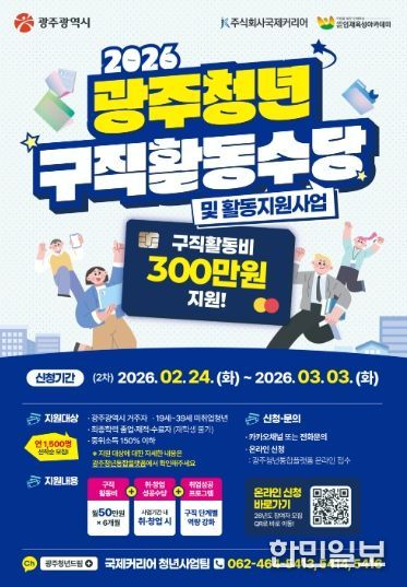 한민일보 서울포커스 임경복 기자 | 광주광역시는 미취업 청년의 안정적인 취업 준비를 지원하기 위해 ‘2026년 광주 청년 구직활동수당 지원’ 2차 참여자 1147명을 오는 3월3일까지 모집한다.