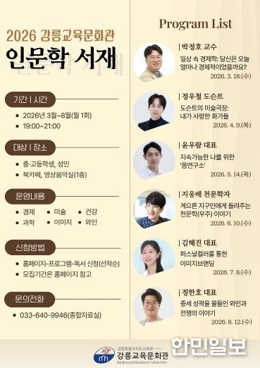 한민일보 서울포커스 곽중희 기자 | 강릉교육문화관은 오는 3월부터 8월까지 총 6회에 걸쳐 청소년 및 성인을 대상으로 ‘2026년 인문학 서재’를 운영한다.