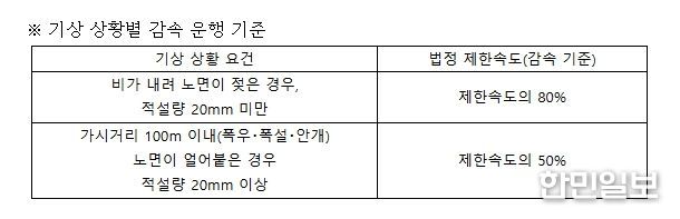 이러한 사전 예고를 바탕으로 악천후 시, 암행순찰차의 단속 기준은 일괄적으로 ‘고속도로 제한속도의 80%(20% 감속)’를 적용할 예정이다. 이는 운전자가 기상・노면 상태에 맞춰 속도를 줄이는 안전운전 문화를 조기에 정착시키고 고속도로 위 대형 사고를 선제적으로 예방하는 조치다.