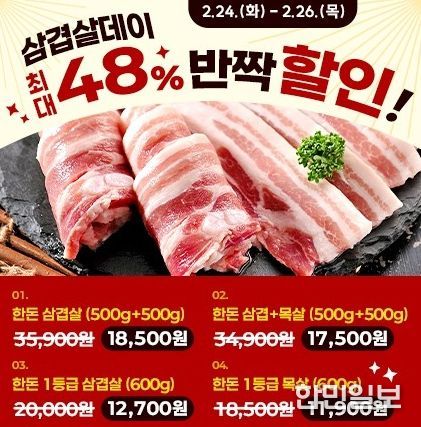 이어 2월 24일부터 26일까지는 ‘삼겹살데이 맞이 반짝 할인전’이 열린다. 온충북에 입점한 고품질 한돈 삼겹살과 목살을 특별 할인가에 선보이며, 고기와 함께 곁을여 먹기 좋은 버섯, 상추 등 쌈채소류도 동시에 할인 판매해 소비자들이 한 번에 다양한 상품을 편리하게 구매할 수 있도록 기획했다.